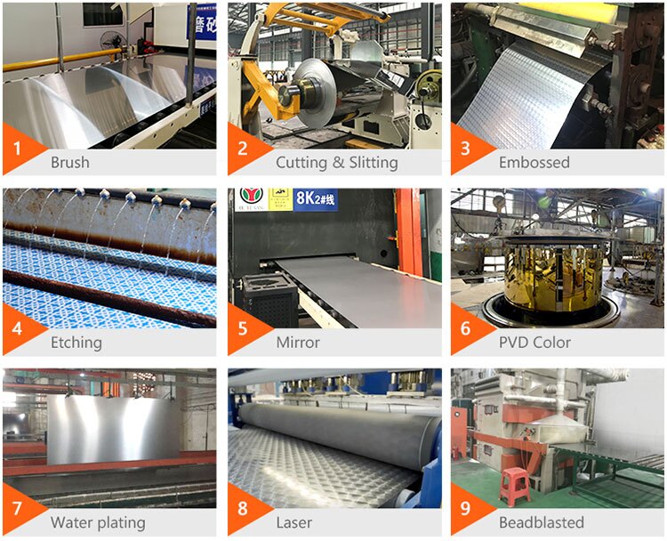 Surface: BA, 2B, 4K, 6K, 8K, NO.4, HL, Embossed, Perforated, Pickling white, polished outside, polished inside and outside